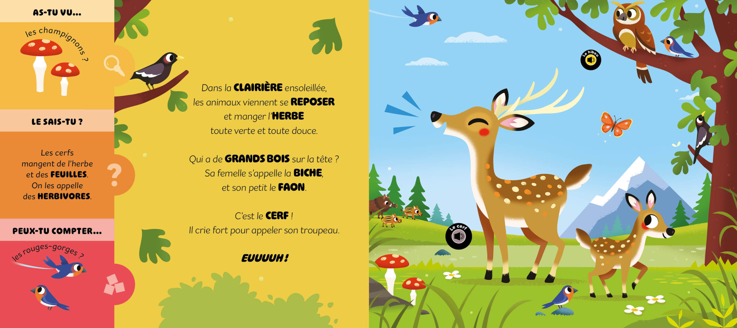Chaque double-page regorge de surprises : compter les animaux, retrouver leurs silhouettes dans les illustrations et écouter les sons qui les accompagnent. Grâce à 55 puces sonores et 10 cris d’animaux différents, les enfants peuvent découvrir les bruits authentiques de la forêt et s’immerger dans un univers naturel et interactif.