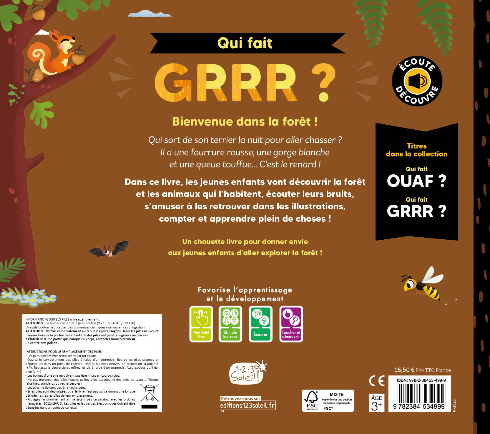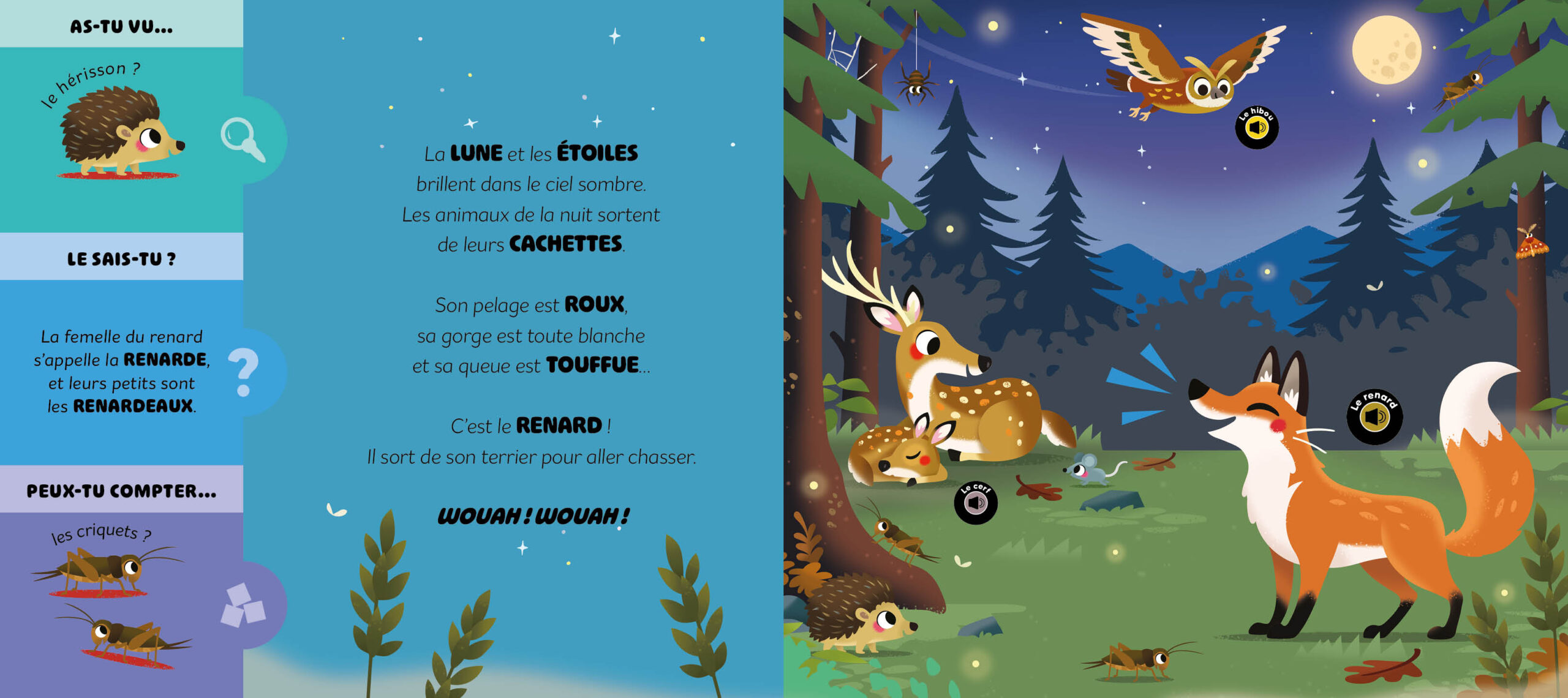 Découvrez la magie de la forêt avec ce livre sonore captivant pour les enfants dès 3 ans ! Qui sort de son terrier la nuit pour chasser ? Avec sa fourrure rousse, sa gorge blanche et sa queue touffue, c’est le renard qui ouvre le bal. Au fil des pages, les tout-petits explorent les secrets de la forêt et rencontrent ses habitants fascinants.
