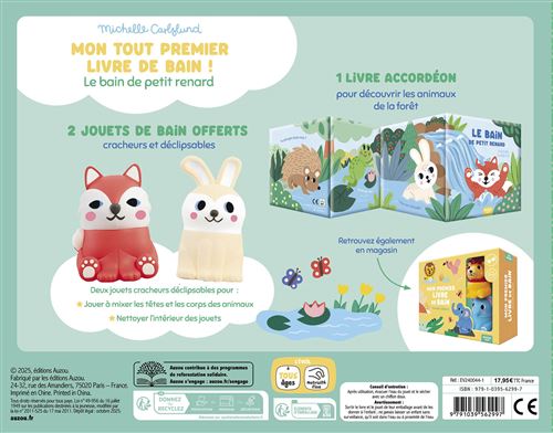 Offrez à votre enfant une expérience de bain ludique et éducative grâce à notre coffret « Découverte des animaux de la forêt ». Ce coffret est conçu pour stimuler l’éveil sensoriel et la curiosité des plus petits, tout en leur permettant de découvrir les merveilles de la nature depuis le confort de leur baignoire. À l’intérieur, vous trouverez un livre de bain en accordéon captivant qui présente les animaux fascinants de la forêt. Ce livre est idéal pour initier les enfants à la faune forestière, en leur permettant de plonger dans un monde d’aventures et de découvertes.