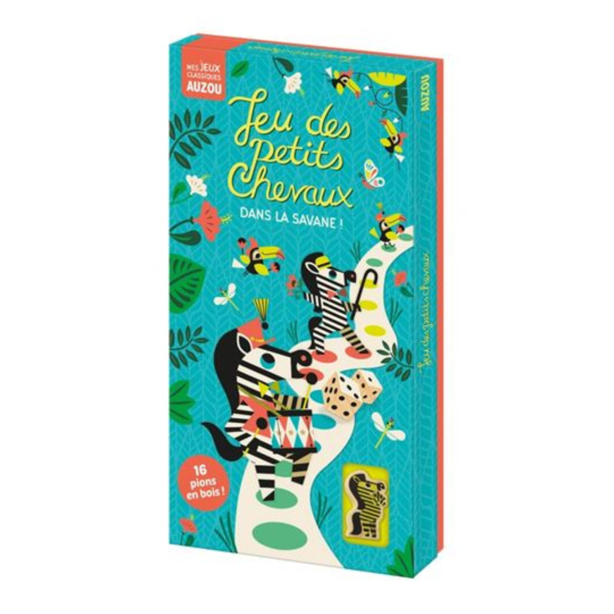 Redécouvrez un grand classique chez Auzou : le jeu des petits chevaux, revisité dans la savane ! Sous les pinceaux talentueux d’Amy Blay, ce jeu mondialement connu prend vie avec des zèbres colorés. Soyez le premier à mener vos zèbres au bout du parcours sur un plateau de jeu recto-verso offrant deux niveaux de difficulté. Avec ses 16 magnifiques pions et ses dés en bois, tout est soigneusement rangé dans un superbe sac en toile. Pour des parties rapides, un niveau simplifié avec moins de cases est disponible, adapté dès l’âge de 3 ans. Une aventure ludique et éducative vous attend !