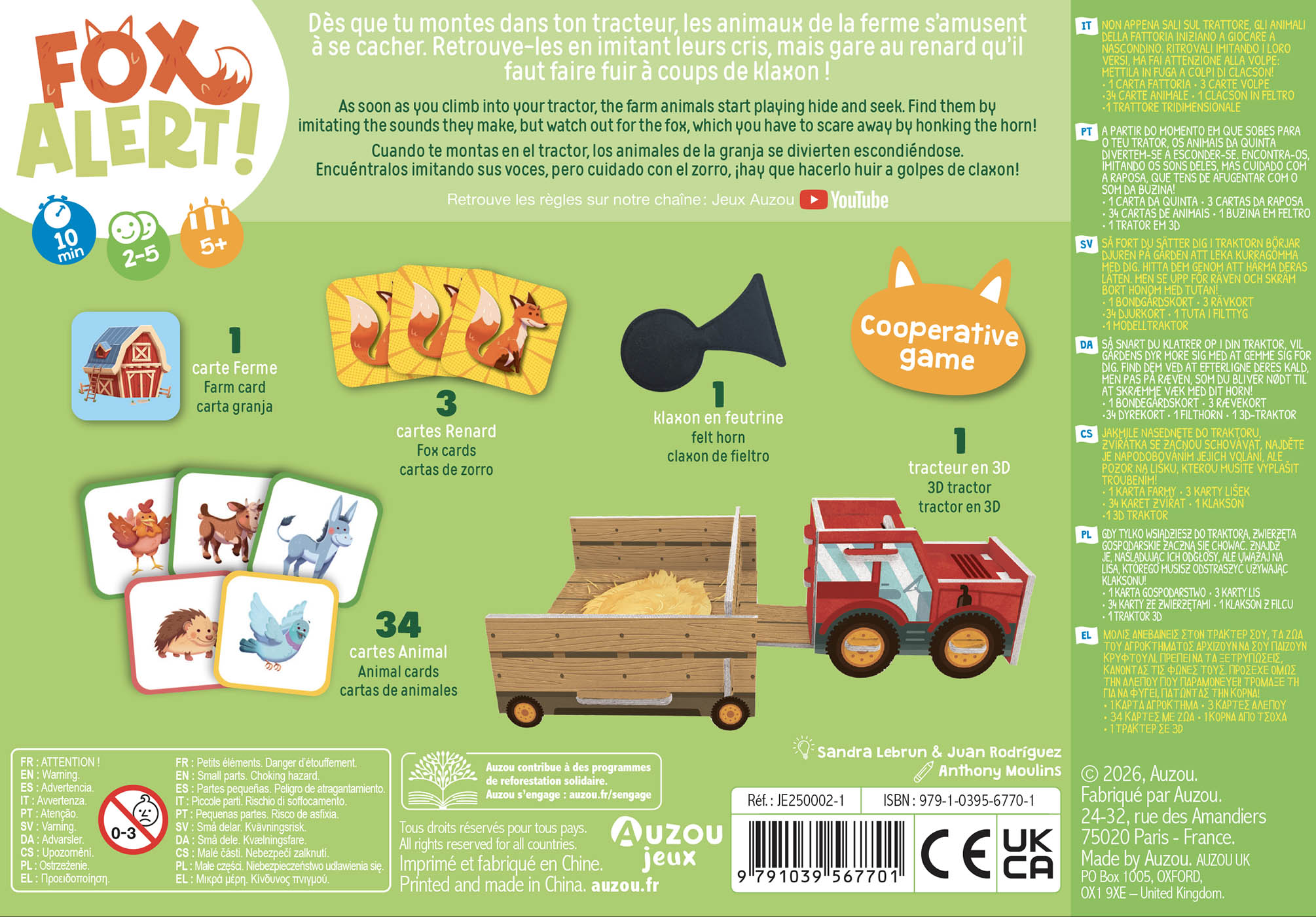Chaque partie est unique et se renouvelle à chaque fois que le tracteur démarre. Le défi est de taille, mais le plaisir partagé est immense. « La Ferme Enchantée » est une invitation à plonger dans un monde où le rire et la collaboration sont les maîtres mots. Que vous soyez en famille ou entre amis, préparez-vous à vivre des moments de pur bonheur autour de la table, en cherchant à sauver vos petits protégés tout en éloignant le renard curieux. Embarquez pour cette aventure sonore et mémorable, et que le meilleur fermier gagne !