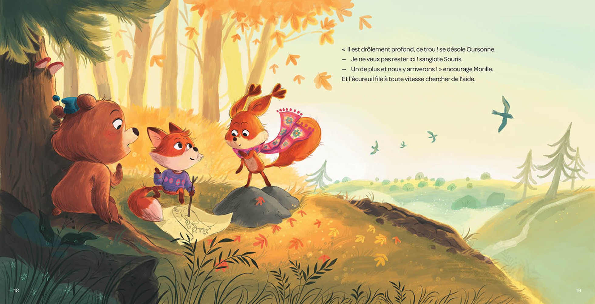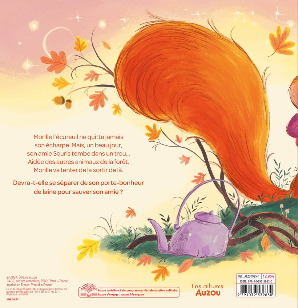 Morille l’écureuil ne quitte jamais son écharpe. Mais un beau jour, son amie Souris tombe dans un trou… Aidée des autres animaux de la forêt, Morille va tenter de la sortir de là. Devra-t-elle se séparer de son porte-bonheur de laine pour sauver son amie ?