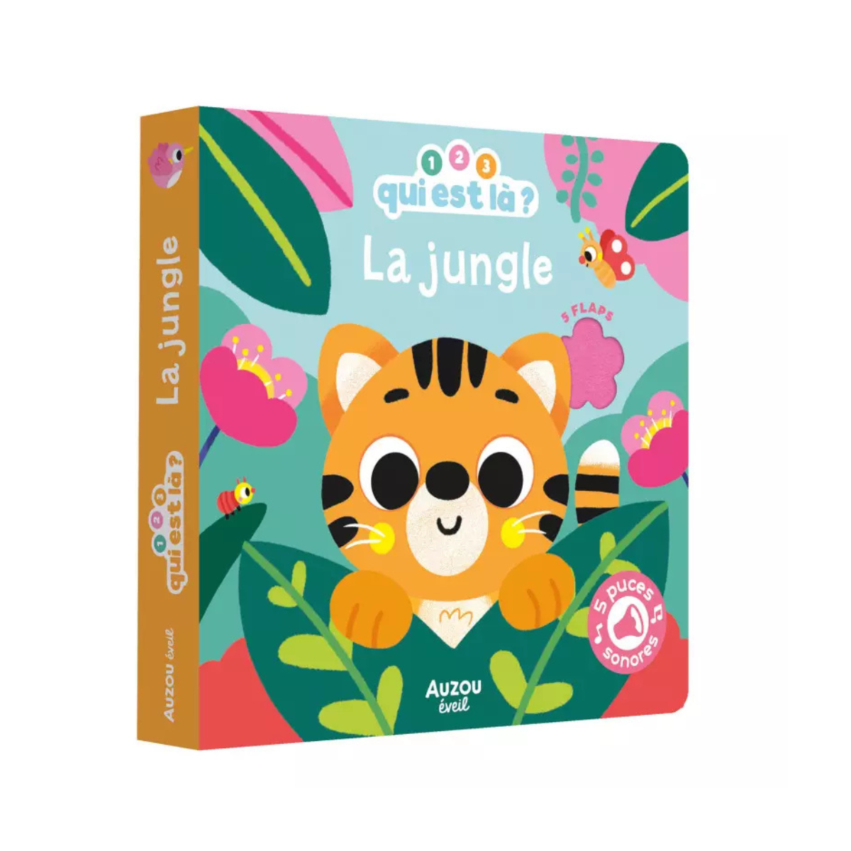 Conçu pour éveiller les sens, ce livre propose 5 flaps en feutrine à soulever. Doux au toucher et faciles à manipuler, ils révèlent à chaque fois un élément caché, stimulant la motricité fine et la curiosité naturelle des tout-petits. En plus de l’exploration visuelle et tactile, 5 puces sonores reproduisent les cris d’animaux emblématiques de la jungle, pour une immersion sonore ludique et éducative. L’enfant apprend à reconnaître les sons du tigre, du singe, du perroquet et d’autres animaux fascinants.