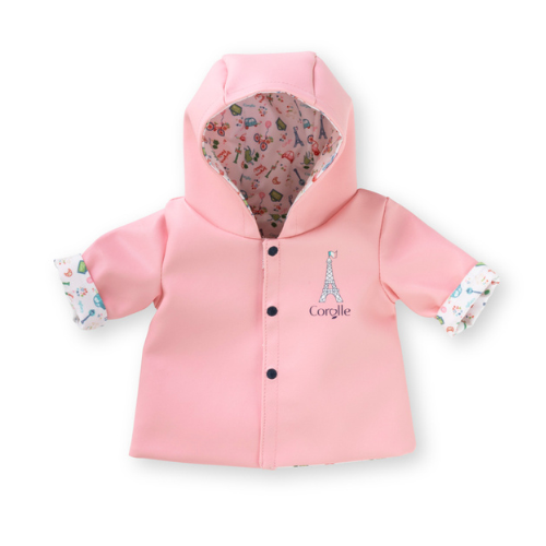 Le ciré est entièrement réversible, offrant deux options pour varier les looks du poupon. Une face rose délicate est ornée d’une sérigraphie de la Tour Eiffel sur la poitrine, apportant une touche très parisienne. L’autre face est entièrement recouverte du tissu exclusif de la collection Week-end à Paris, présentant de nombreux clins d’œil à la capitale française. Cette double fonctionnalité permet aux enfants de personnaliser leur poupon et de stimuler leur imagination en créant différents styles et histoires.