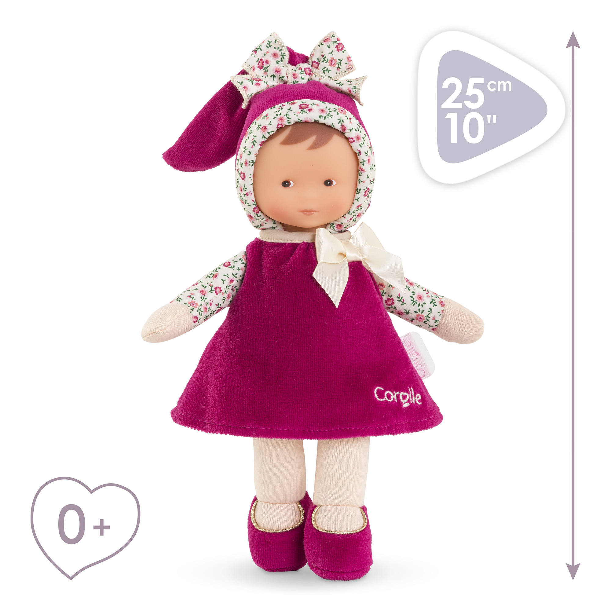 Ma Miss Rose Grenadine est habillée d’une robe en velours rose framboise toute douce, ornée d’un nœud satinéautour du cou et d’un motif fleuri sur son corps. Elle porte un bonnet assorti, décoré d’un nœud à fleurs, et ses ballerines dorées brillent avec élégance. Une broderie “Corolle” vient parfaire son look plein de tendresse.