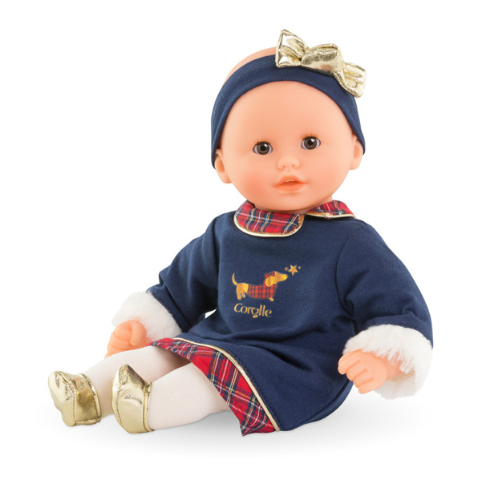 Ce poupon a la peau claire et de jolis yeux marron, qui lui donnent une expression douce et attendrissante. Pour célébrer les fêtes, elle porte une splendide tenue de Noël : une robe bleu marine à manches longues, décorée de manchettes en imitation fourrure blanche, de touches de tissu écossais au col claudine et à l’ourlet, ainsi que de détails dorés qui apportent une note lumineuse. Une délicate sérigraphie pailletée représentant un petit teckel en manteau écossais ajoute un charme irrésistible. Margaux porte également un collant crème et des ballerines dorées tout-en-un, ainsi qu’un bandeau assorti orné d’un nœud doré.