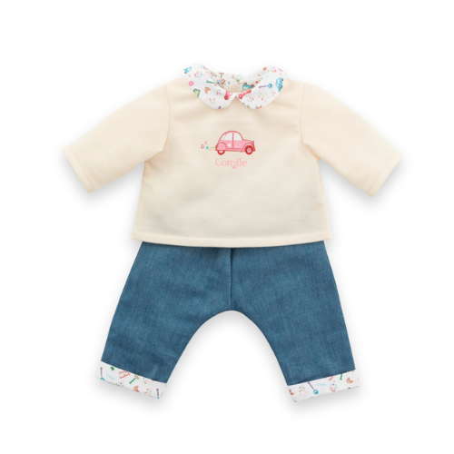L’ensemble se compose d’un t-shirt crème à manches longues, décoré d’une charmante illustration d’une voiture 4L, et d’un pantalon bleu imitation denim. Les détails soignés apportent une touche unique : l’imprimé exclusif « Week-end à Paris » est présent sur le col Claudine du t-shirt, sur les coudières des manches et sur l’ourlet du pantalon, faisant de cette tenue un véritable clin d’œil à la capitale française. Cette attention aux détails reflète le savoir-faire Corolle et le soin apporté à chaque création.