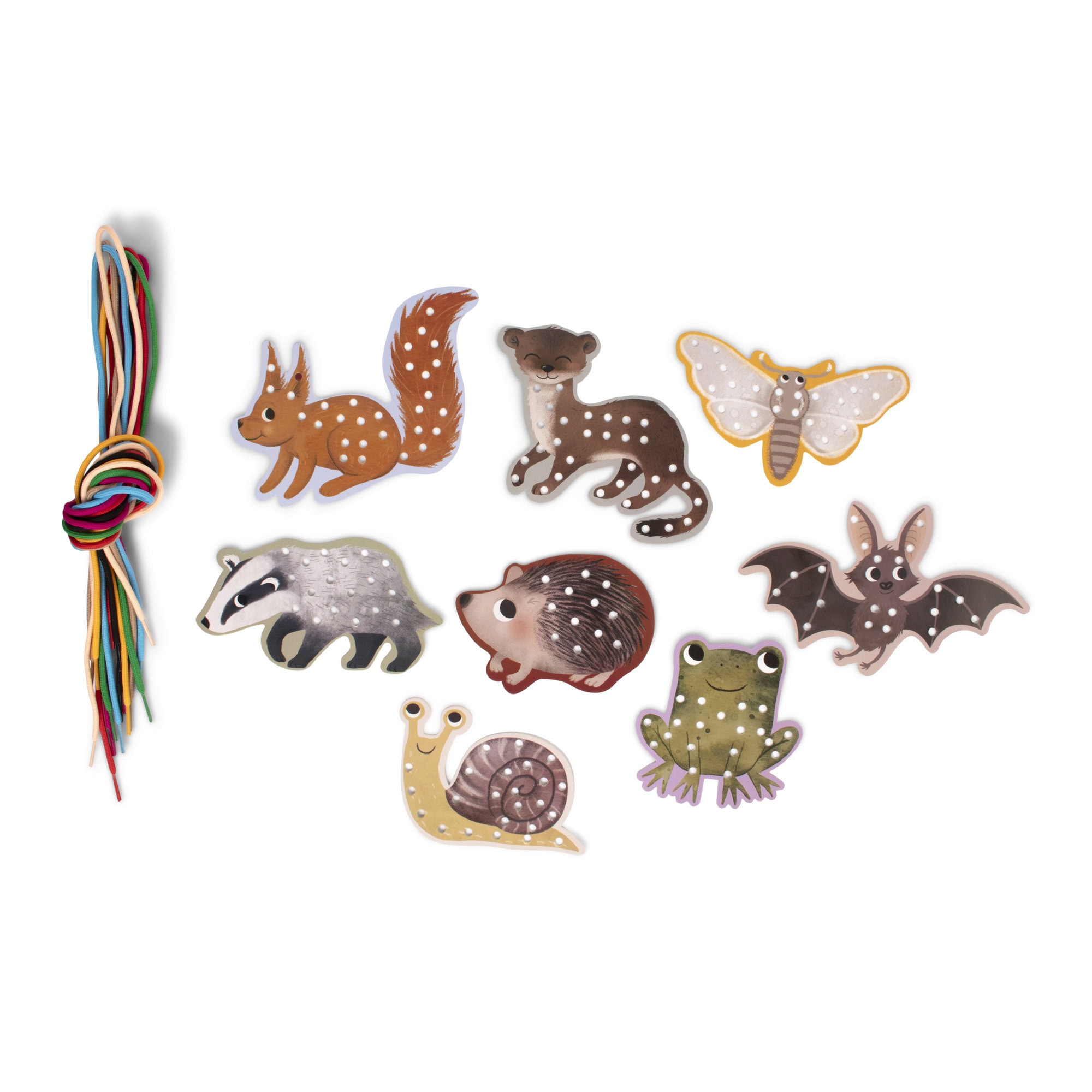 Grâce à des ficelles colorées, les enfants tissent de jolis motifs en les passant simplement avec leurs doigts à travers des trous pré-perforés. Les huit pochoirs d’animaux, merveilleusement illustrés à la main, offrent un support attrayant et inspirant : chaque animal devient une œuvre personnalisée à décorer selon l’envie et la créativité de l’enfant. Les motifs prennent vie progressivement, renforçant la concentration et la satisfaction d’accomplir un projet créatif.