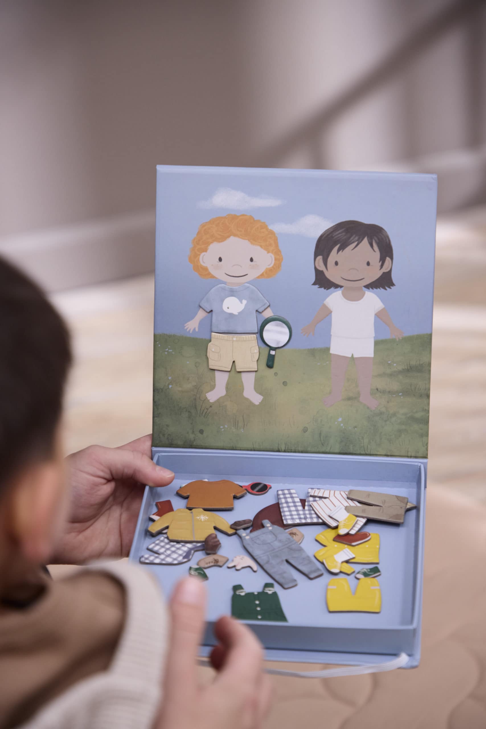 Un véritable classique revisité dans une version moderne et pleine de charme. Avec ce jeu magnétique créatif, les enfants aident deux petits aventuriers à se préparer pour leur prochaine expédition. Qu’il pleuve, qu’il vente ou que le soleil brille, ils disposent d’un large choix de vêtements et d’accessoires pour affronter toutes les situations. Vestes, bottes, chapeaux et équipements variés permettent d’imaginer une multitude de scénarios et d’histoires.