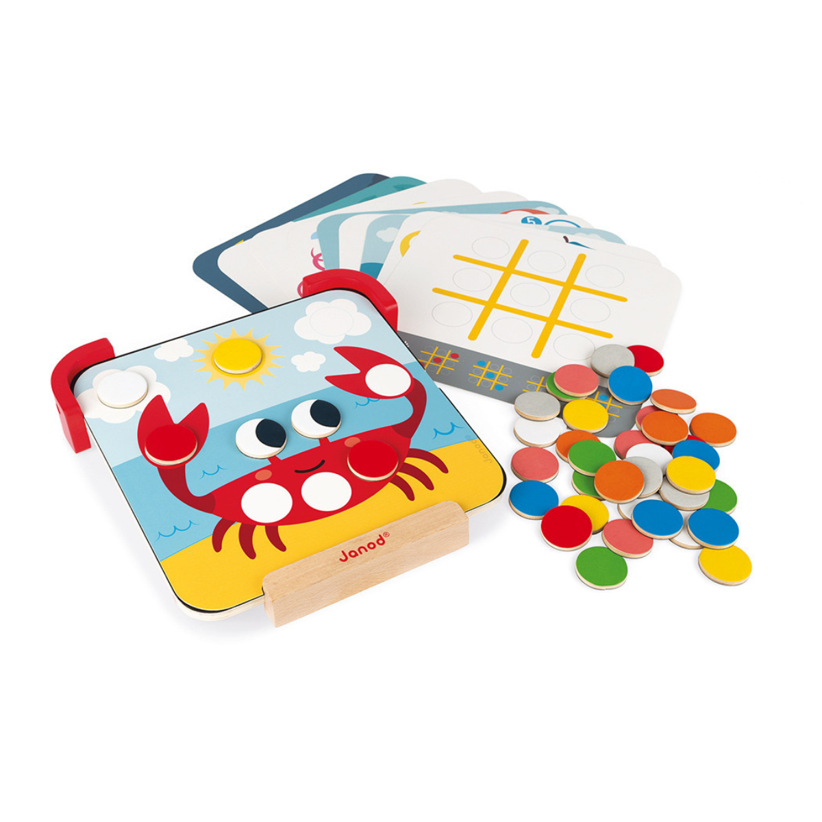 Le principe est simple : l’enfant place une carte sur l’ardoise magnétique, puis repositionne les 42 pastilles magnétiques colorées au bon endroit pour finaliser son dessin. Grâce à ses grandes pastilles faciles à manipuler, ce jeu est parfaitement adapté aux petites mains.
