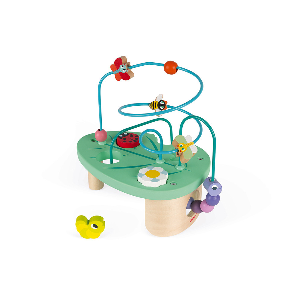 Ce jouet propose plusieurs activités stimulantes : faire coulisser les perles colorées en forme de papillons, chenille et abeille le long des tiges, et encastrer les 3 pièces de puzzle représentant une fleur, une chenille et une coccinelle. Ces actions permettent à l’enfant de développer sa motricité fine, sa coordination main-œil et sa concentration.