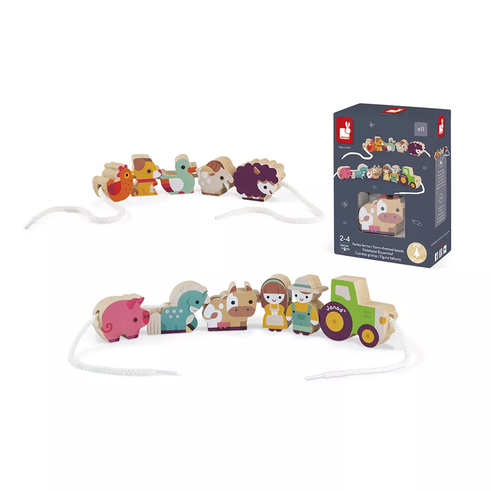 Le set comprend 11 perles figurines en bois aux formes et tailles variées, allant de 35 x 35 mm pour la poule à 66 x 55 mm pour le tracteur. Ces dimensions adaptées permettent aux petites mains de saisir et manipuler les pièces en toute sécurité.