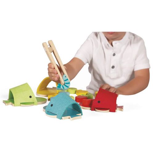 Le principe est simple et captivant : grâce à la pince en bois fournie, l’enfant doit attraper les animaux marins colorés (crevettes, poissons, méduses) et les placer dans la baleine de la même couleur. Le poisson jaune va dans la baleine jaune, la crevette rouge dans la baleine rouge, et ainsi de suite. Ce jeu favorise l’apprentissage des couleurs, l’observation, la logique et le contrôle des gestes tout en rendant l’exercice amusant.