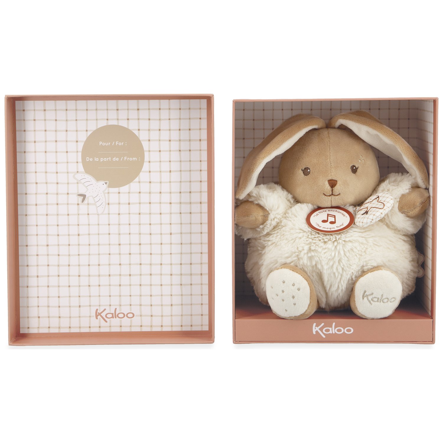 Présentée dans une élégante boîte cadeau assortie, cette peluche devient un présent parfait pour une naissance. L’encart sous le couvercle de la boîte peut être personnalisé, faisant de cet emballage un souvenir précieux à conserver. La boîte elle-même peut être réutilisée pour ranger des objets ou des souvenirs précieux de bébé, ajoutant une dimension pratique à ce cadeau déjà exceptionnel. Le lapin musical Kaloo, avec sa douceur et sa mélodie apaisante, est un choix idéal pour accompagner bébé dans ses premiers moments de vie, offrant sécurité, confort, et émerveillement musical.