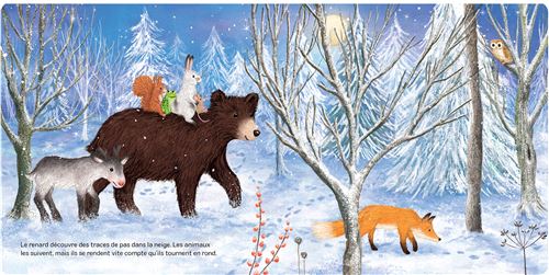 Dans la forêt, le petit renne se sentait perdu et désorienté. La neige tombait doucement, recouvrant les sentiers d’un épais manteau blanc. C’est alors qu’il rencontra un groupe d’animaux de la forêt, menés par un vieux hibou sage. Voyant le désarroi du jeune renne, les animaux décidèrent de l’aider à retrouver son chemin. Le hibou, avec sa connaissance des lieux, guida le petit renne à travers les arbres enneigés, tandis que les écureuils et les lièvres l’encourageaient de leurs chants joyeux.