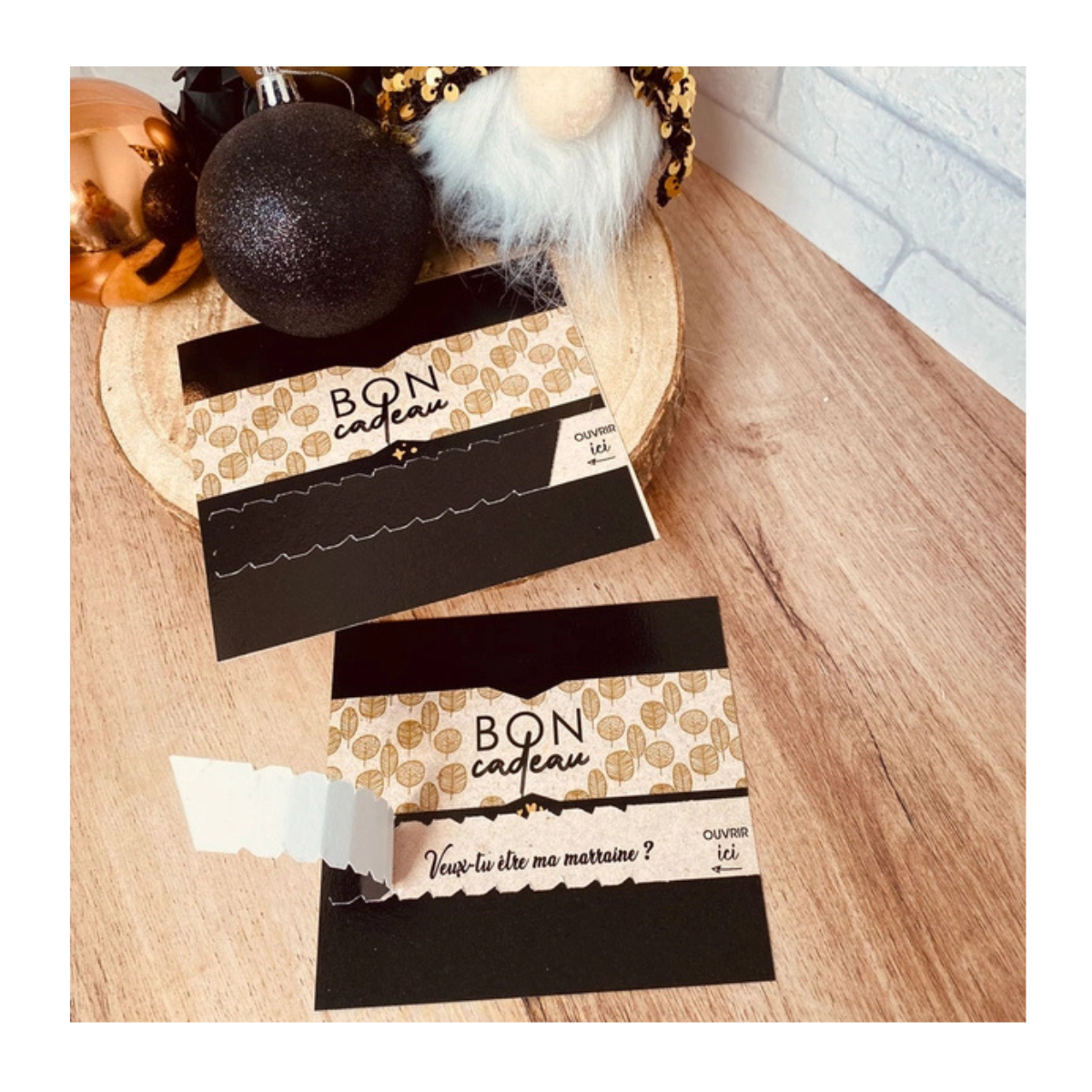 Ce bon cadeau est idéal pour annoncer de façon originale votre grossesse à la future famille de votre petit bout. Il dissimule bien son secret… La languette prédécoupée dévoile le message suivant : « Veux-tu être ma marraine ? »