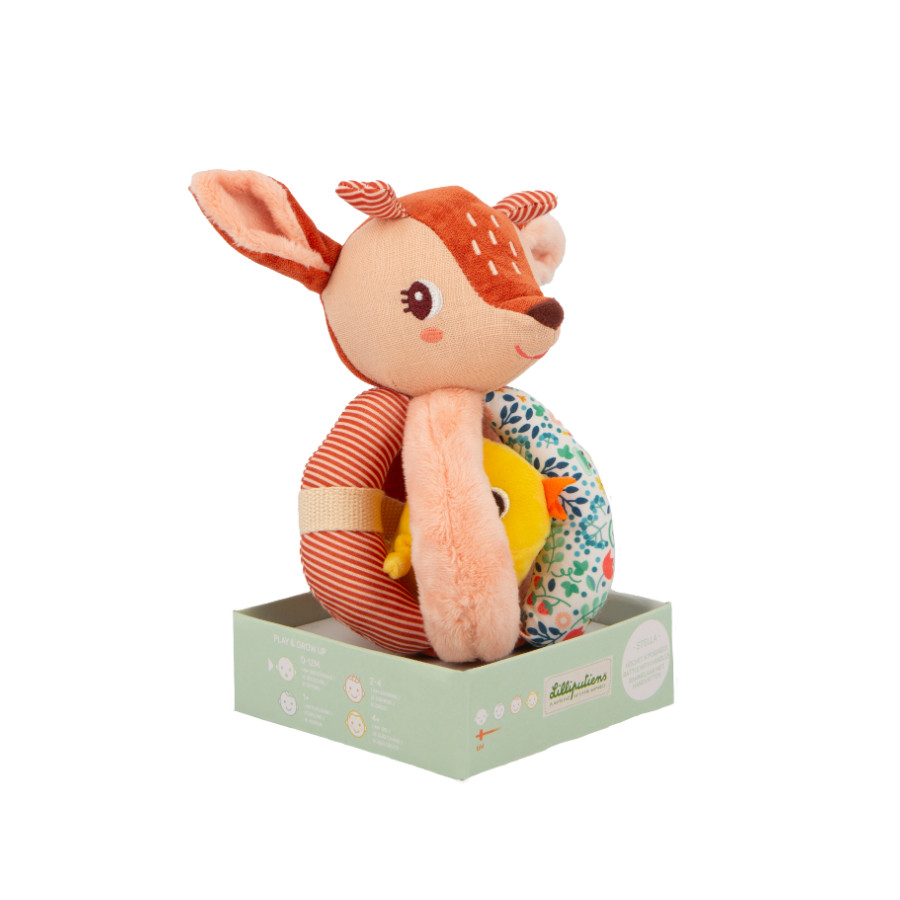 Dans la tête de Stella le faon, bébé découvrira un hochet sonore qu’il pourra faire tinter encore et encore, parfait pour l’initier aux sons. Les cinq poignées qui composent le jouet offrent chacune des matières et motifs différents, encourageant l’exploration tactile et visuelle. Pour encore plus de surprise, la poignée rose cache du papier bruissant à faire crépiter sous les doigts. Enfin, un deuxième hochet se cache dans le petit oiseau, accessible en plongeant la main dans le corps de Stella, à travers les poignées. Un jeu amusant qui stimule la motricité fine et la coordination œil-main.