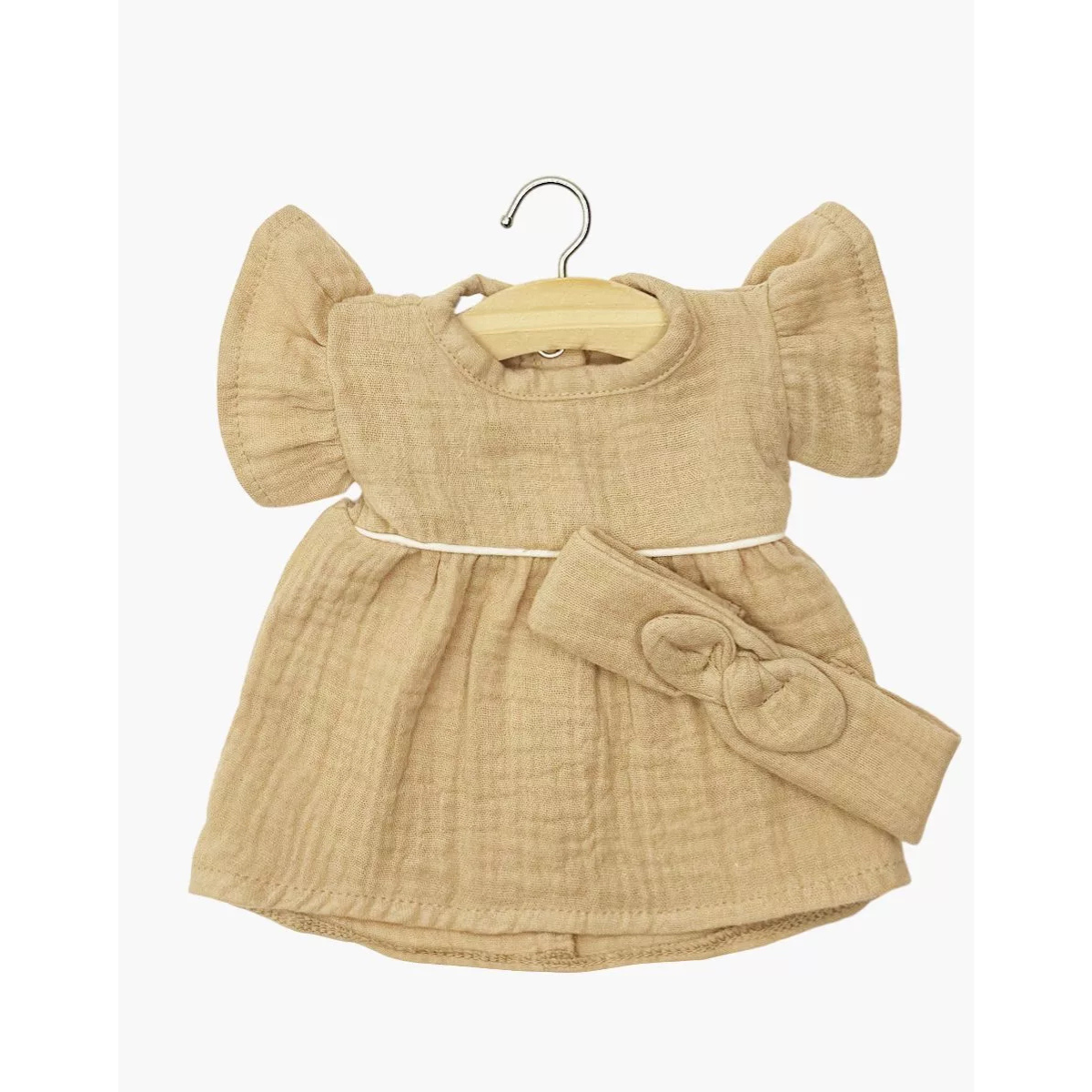 Robe Daisy et son headband à noeud rond en gaze de coton pour poupées Minikane Gordis 34 & 37cm.