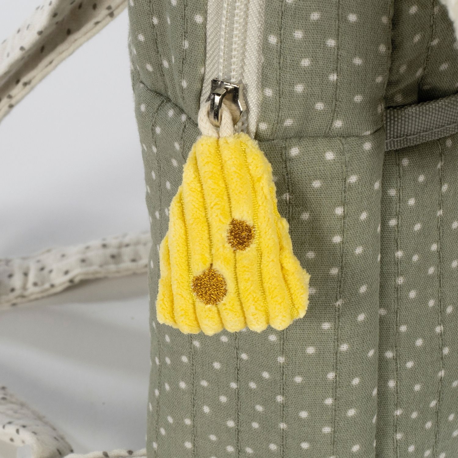 Fabriqué en 100 % coton recyclé, imprimé de délicats petits pois, ce sac offre une matière douce, résistante et durable. Sa qualité de fabrication garantit une longue vie, même entre les mains parfois maladroites des tout-petits ! Comme toujours chez Walking Mum, la sécurité est primordiale : le sac est conçu sans colorants azoïques ni substances nocives, pour le bien-être de votre enfant.