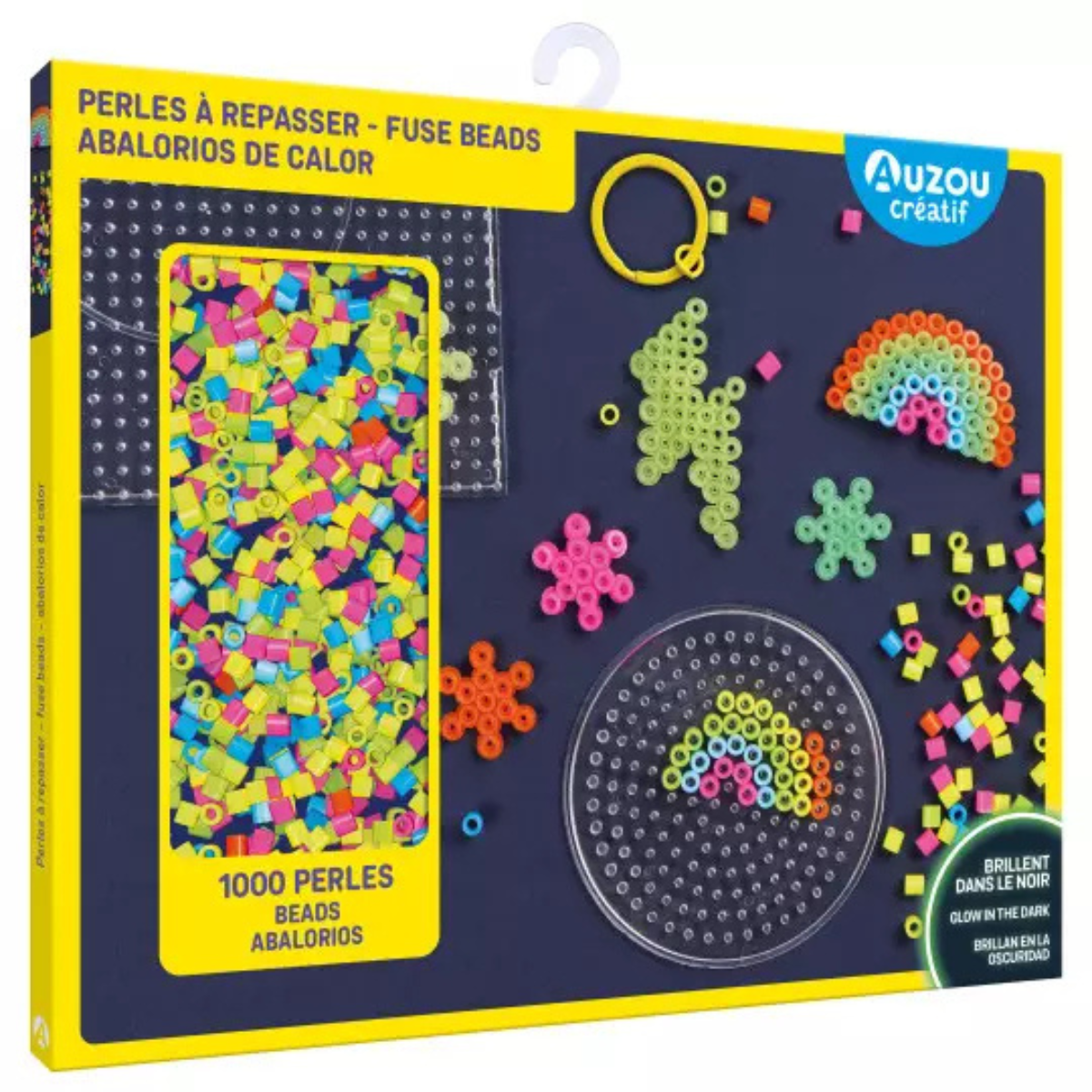 Réalise des créations éclatantes et amusantes avec ta pochette complète de perles à repasser ! Cette trousse est idéale pour tous les enfants qui aiment laisser libre cours à leur imagination et créer des modèles colorés et personnalisés. Avec 1000 perles, dont 500 qui brillent dans le noir, tu pourras inventer des designs lumineux qui s’illuminent dès que la lumière s’éteint, apportant une touche de magie à tes créations.
