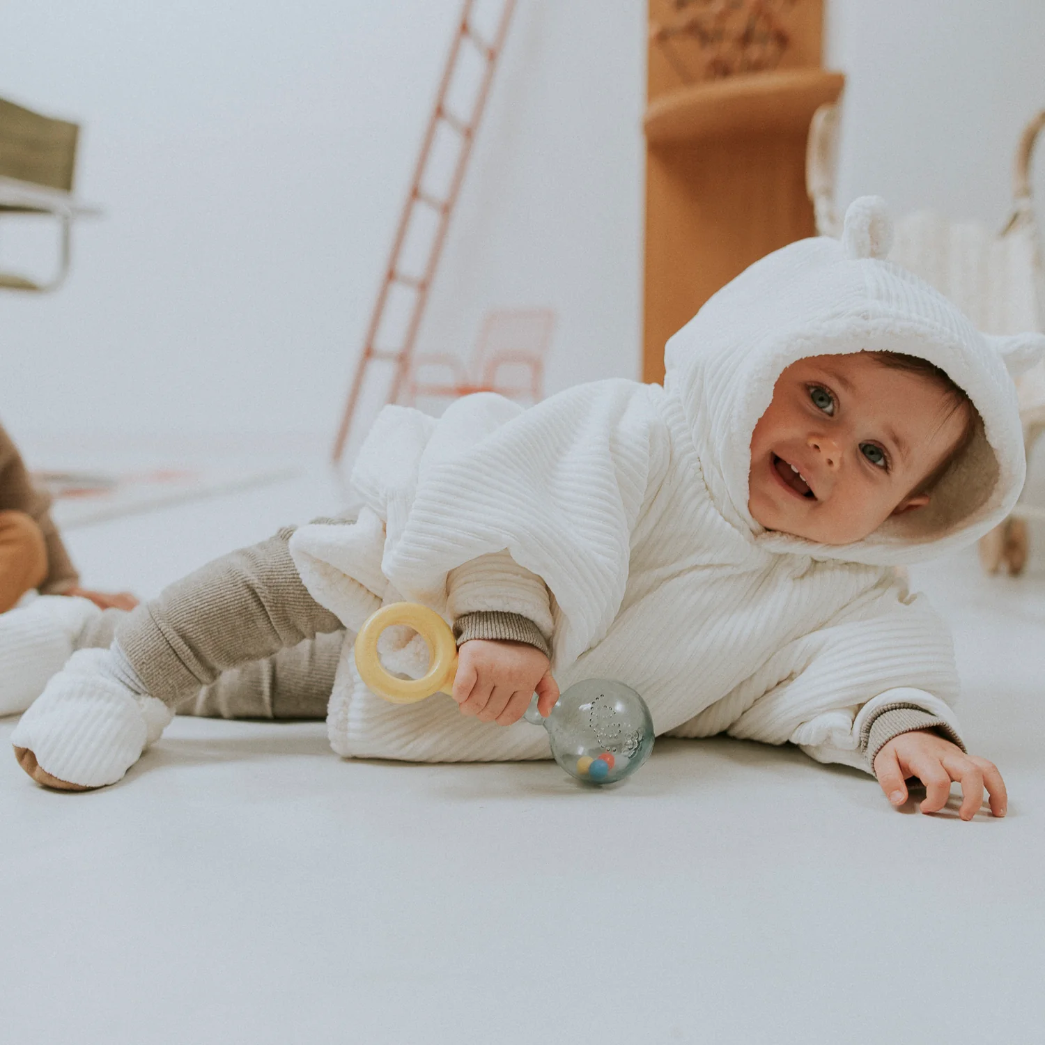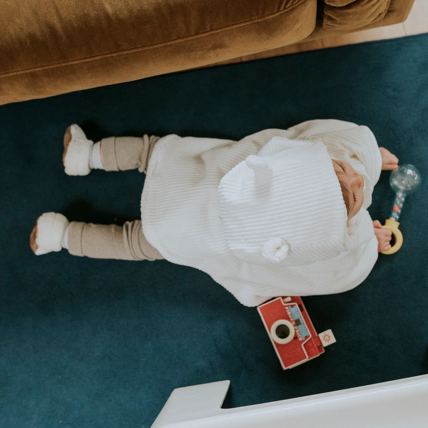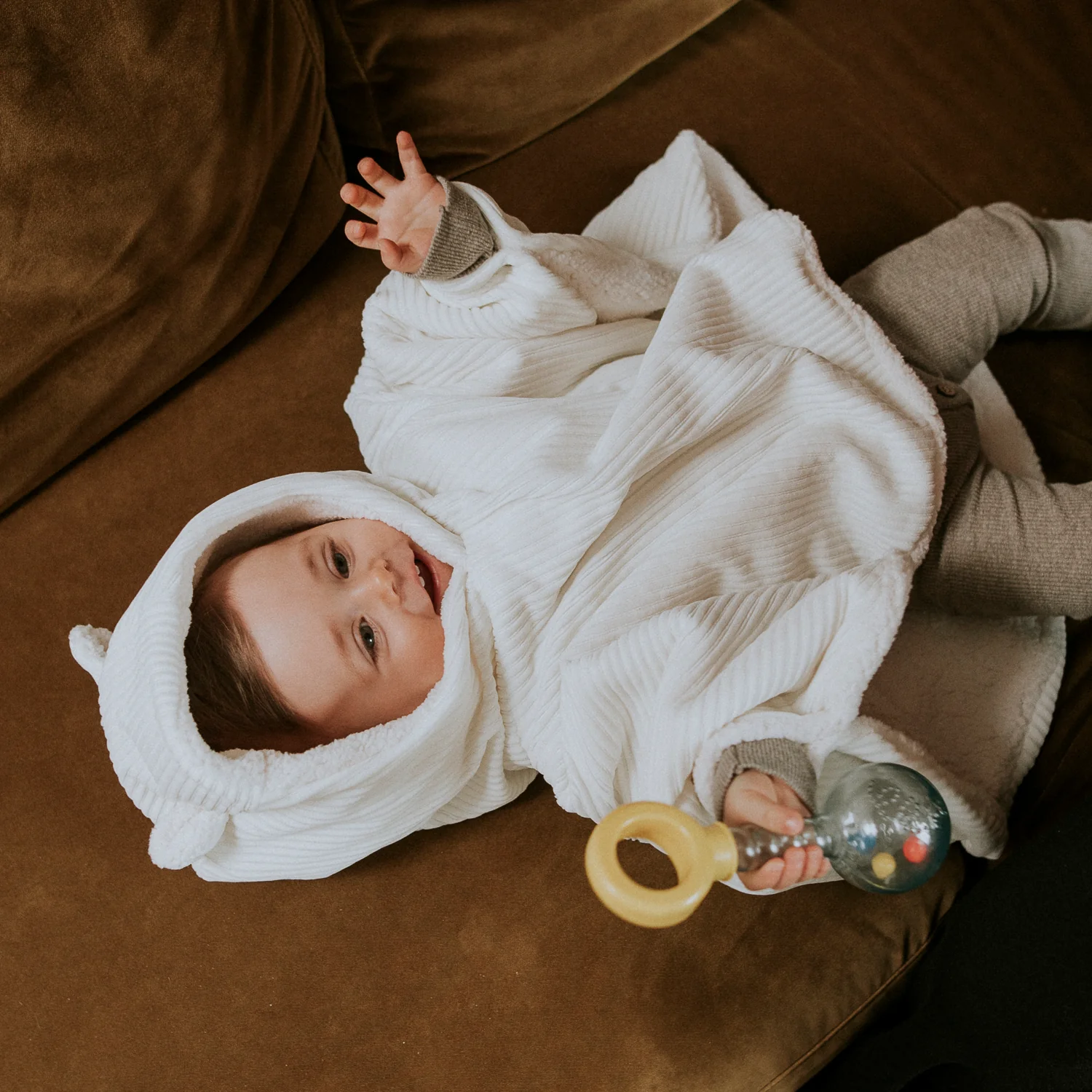 Le velours côtelé écru apporte une élégance intemporelle et s’associe facilement à toutes les tenues, tandis que la doublure teddy enveloppe bébé dans une chaleur douce et réconfortante. Sa coupe ample et sans manches facilite l’enfilage, même pour les enfants les plus impatients, et permet de l’utiliser directement dans le siège auto sans enlever le poncho, garantissant sécurité et confort pendant les trajets. La qualité des matériaux assure une tenue durable, résistant aux lavages fréquents tout en conservant sa douceur initiale.