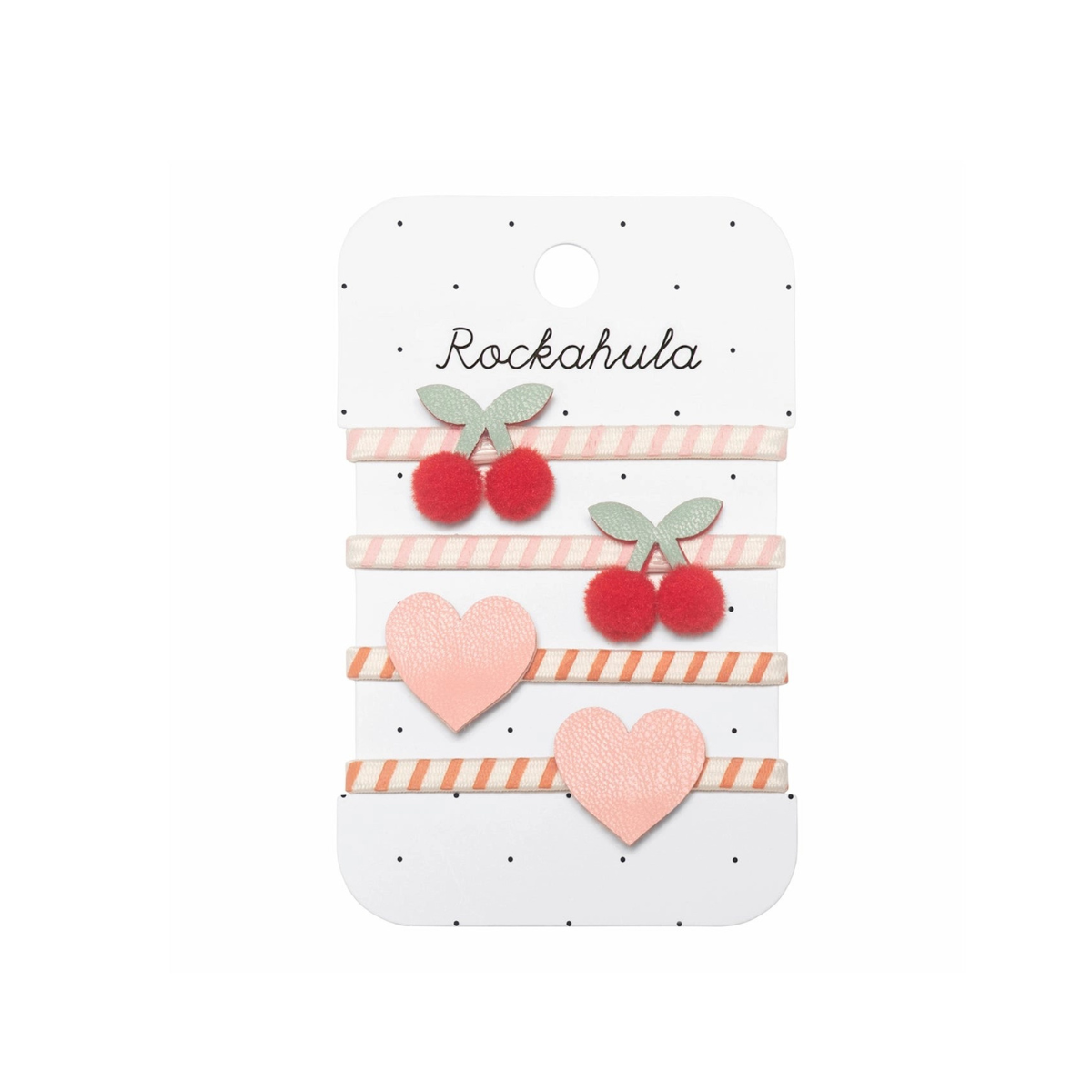 Deux élastiques sont ornés de cerises pompons amusantes, avec de jolies tiges vertes finement détaillées, posées sur des élastiques à rayures roses pour un effet frais et dynamique. Les deux autres présentent de charmants cœurs roses assortis, également montés sur des élastiques à rayures, pour une touche tendre et romantique. L’ensemble crée un équilibre parfait entre fantaisie et douceur.