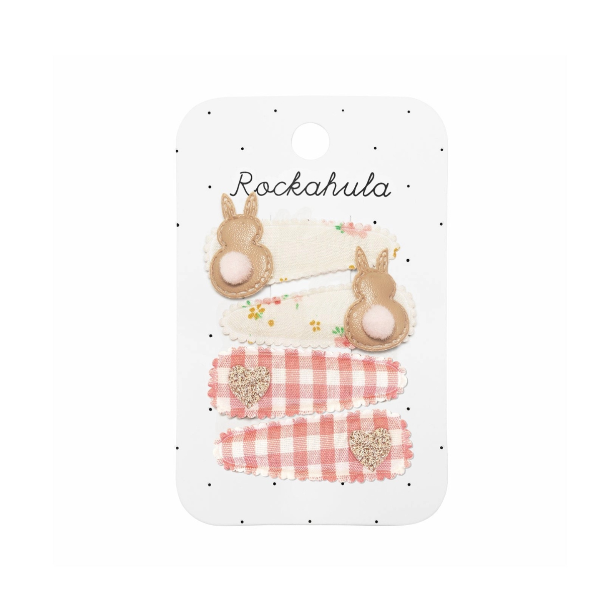 Deux pinces sont enveloppées dans un ravissant tissu à petites fleurs et ornées de jolis lapins en PU, chacun doté d’une petite queue en pompon pour une touche pleine de tendresse. Les deux autres pinces sont habillées d’un tissu vichy rose intemporel et décorées de cœurs en paillettes dorées, ajoutant une note scintillante et joyeuse. L’association des motifs fleuris, du vichy et des détails brillants crée un ensemble harmonieux, parfait pour la saison.
