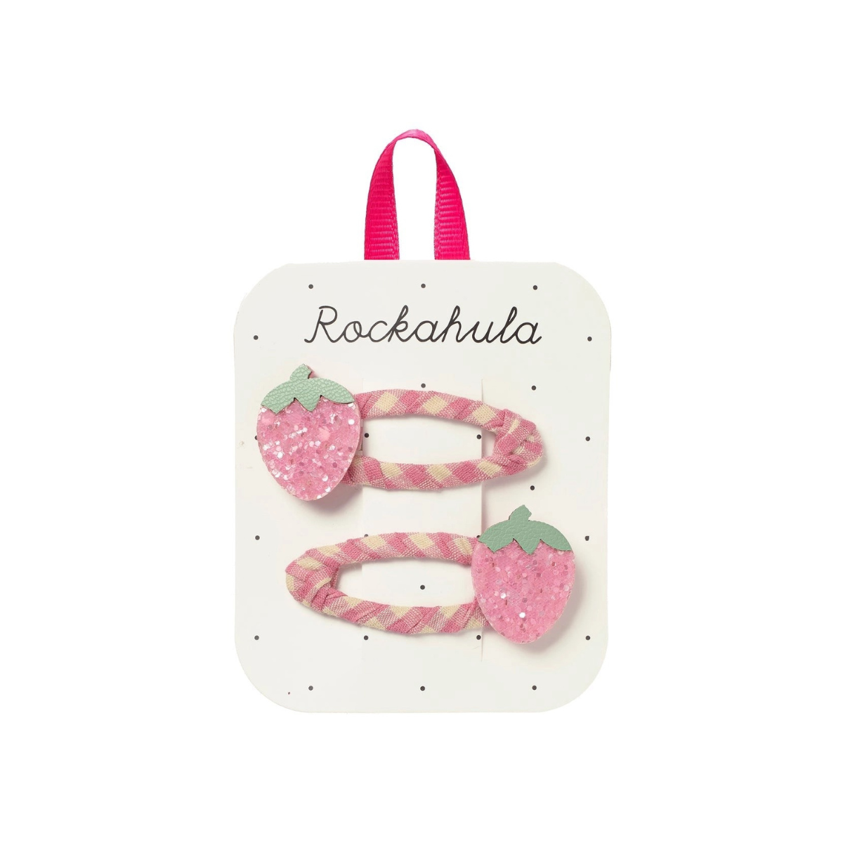 Chaque pince est ornée d’une délicate fraise rose étincelante, soigneusement détaillée avec une couronne verte finement travaillée. Les finitions scintillantes captent la lumière et ajoutent une touche joyeuse et lumineuse à chaque mouvement. Les fraises sont posées sur deux pinces à pression enveloppées d’un ruban vichy rose, pour un look à la fois rétro, frais et plein de charme.