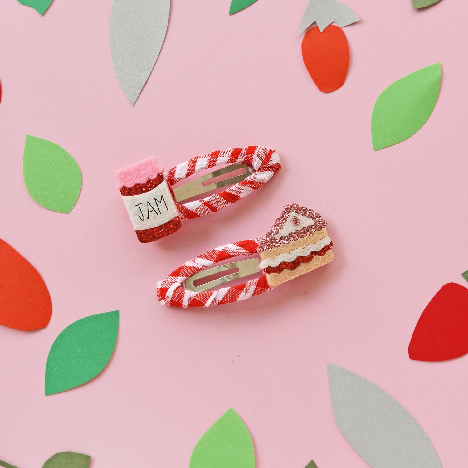Chaque motif est soigneusement fixé sur une pince à pression enveloppée d’un ruban gros-grain à pois, assurant un maintien confortable et sécurisé dans les cheveux. Les détails pailletés captent délicatement la lumière, ajoutant une note joyeuse et ludique à chaque coiffure. Ces pinces sont parfaites pour accessoiriser une tenue lors d’un pique-nique au soleil, d’un anniversaire ou simplement pour apporter une touche sucrée au quotidien.
