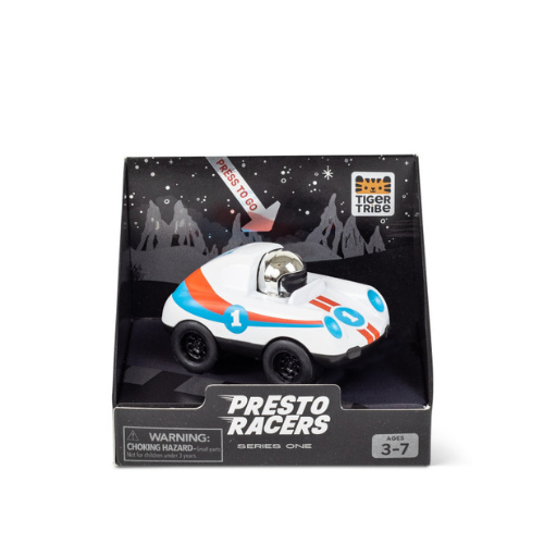 La voiture Presto Racers ace blanche de Tiger Tribe est prête à faire vrombir l’imagination des petits pilotes en herbe ! Avec son look de bolide de course, son numéro 1 et son pilote au casque chromé, elle ne passe pas inaperçue. Élégante, rapide et pleine de caractère, cette voiture rouge incarne à la perfection l’esprit de la compétition et de l’aventure.