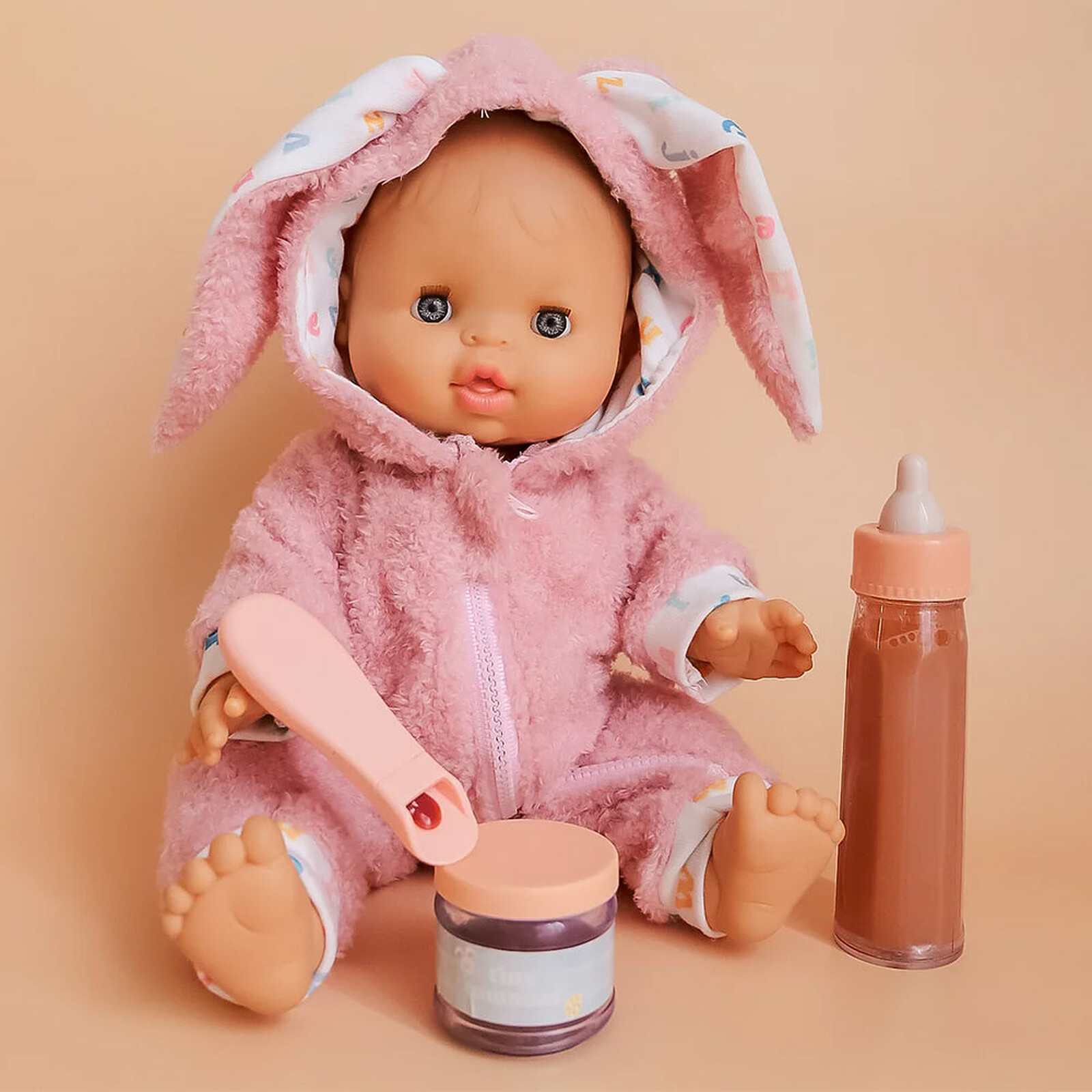 Le coffret comprend également un biberon magique. Lorsque l’enfant l’incline pour donner à boire à sa poupée, le liquide semble se vider peu à peu, créant l’illusion parfaite d’un repas complet.