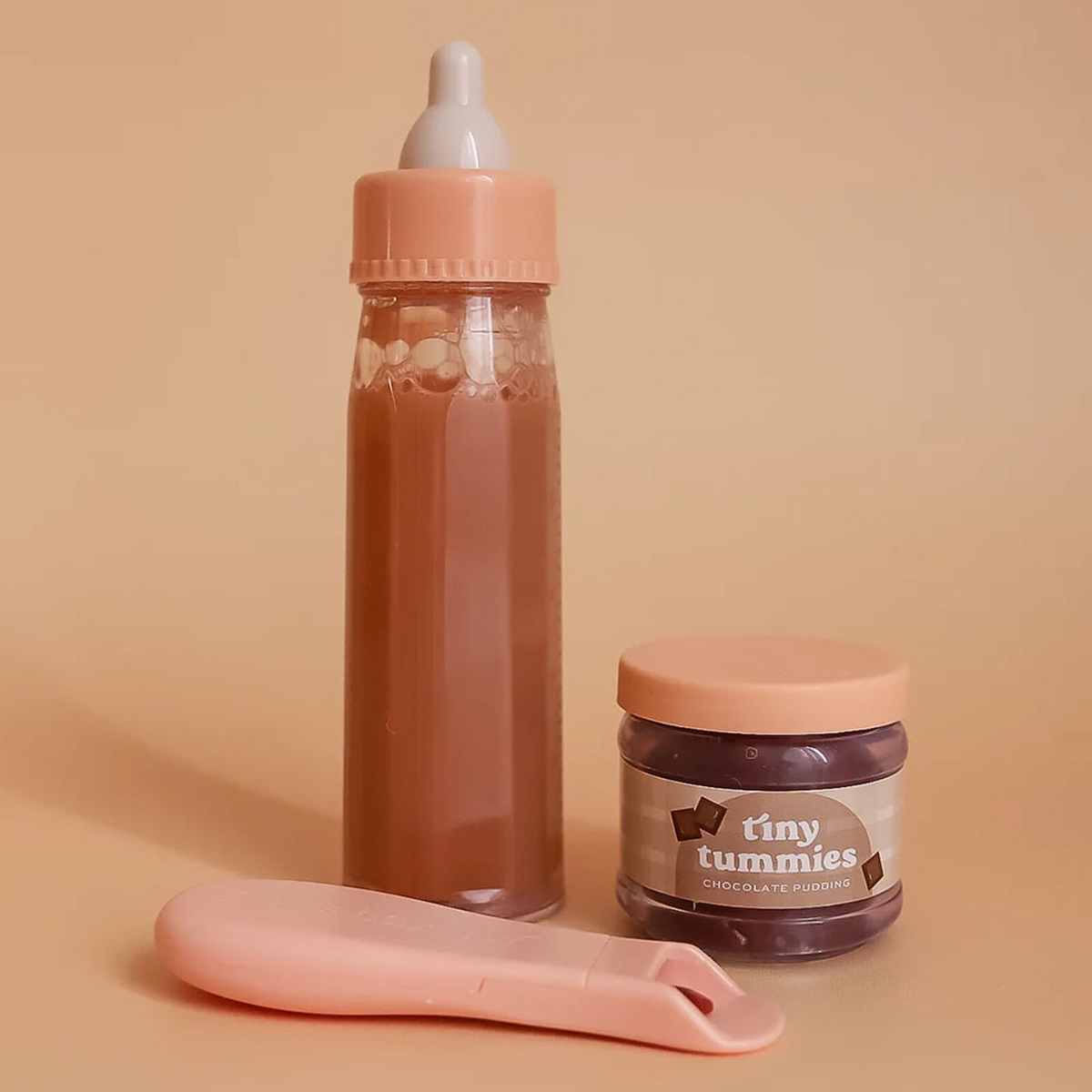 À l’intérieur, on trouve un petit pot magique au délicieux parfum de chocolat accompagné de sa cuillère spéciale. Le principe est simple et fascinant : il suffit de plonger la cuillère dans le pot pour la voir ressortir garnie d’une gelée appétissante. En approchant ensuite la cuillère de la bouche de la poupée, la nourriture disparaît aussitôt… comme par magie ! Ce tour amusant est possible grâce au mécanisme rétractable intégré, qui émerveillera les jeunes enfants à chaque utilisation.
